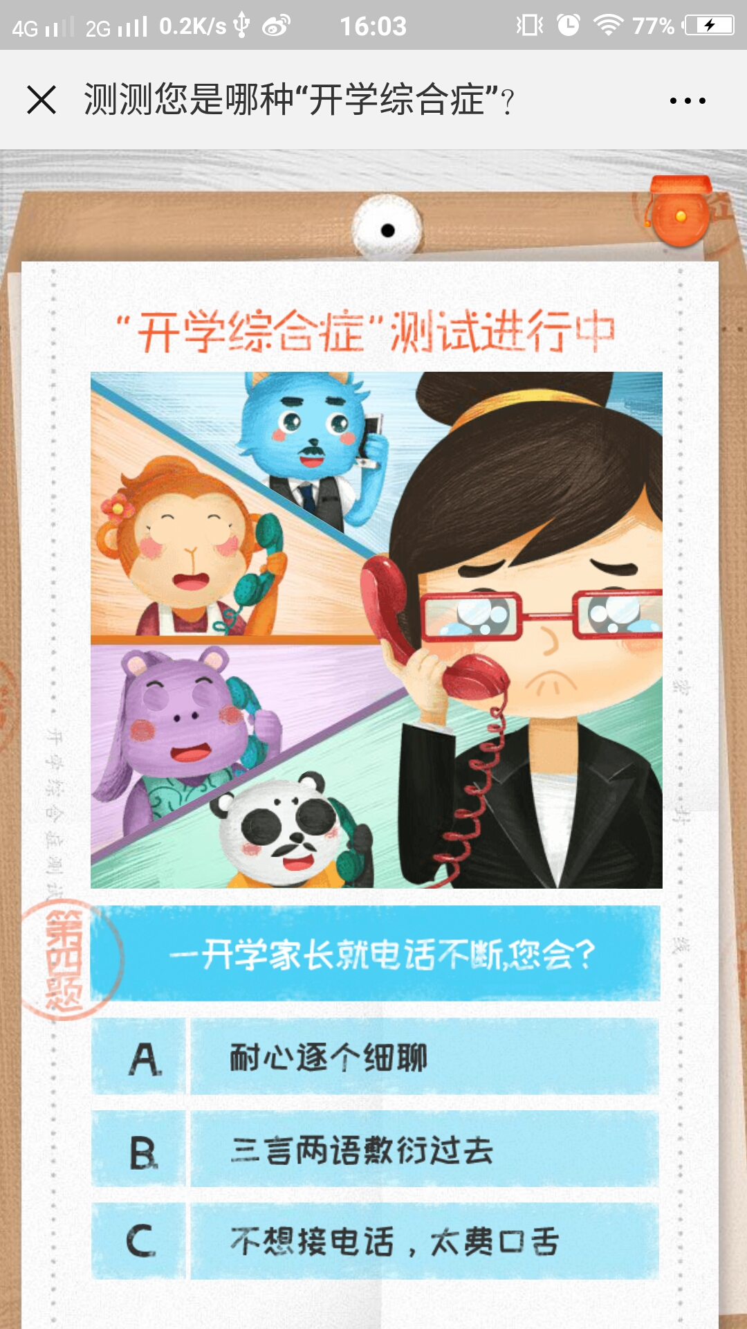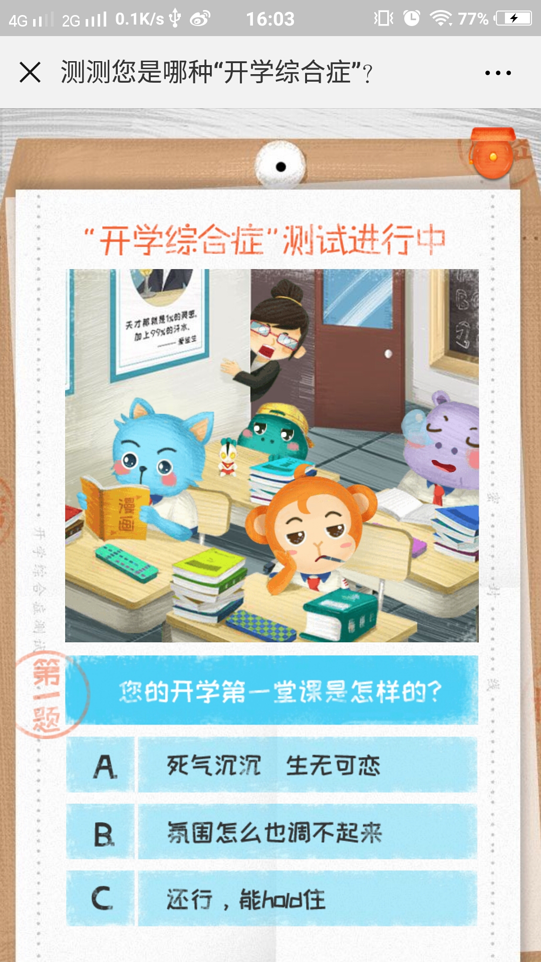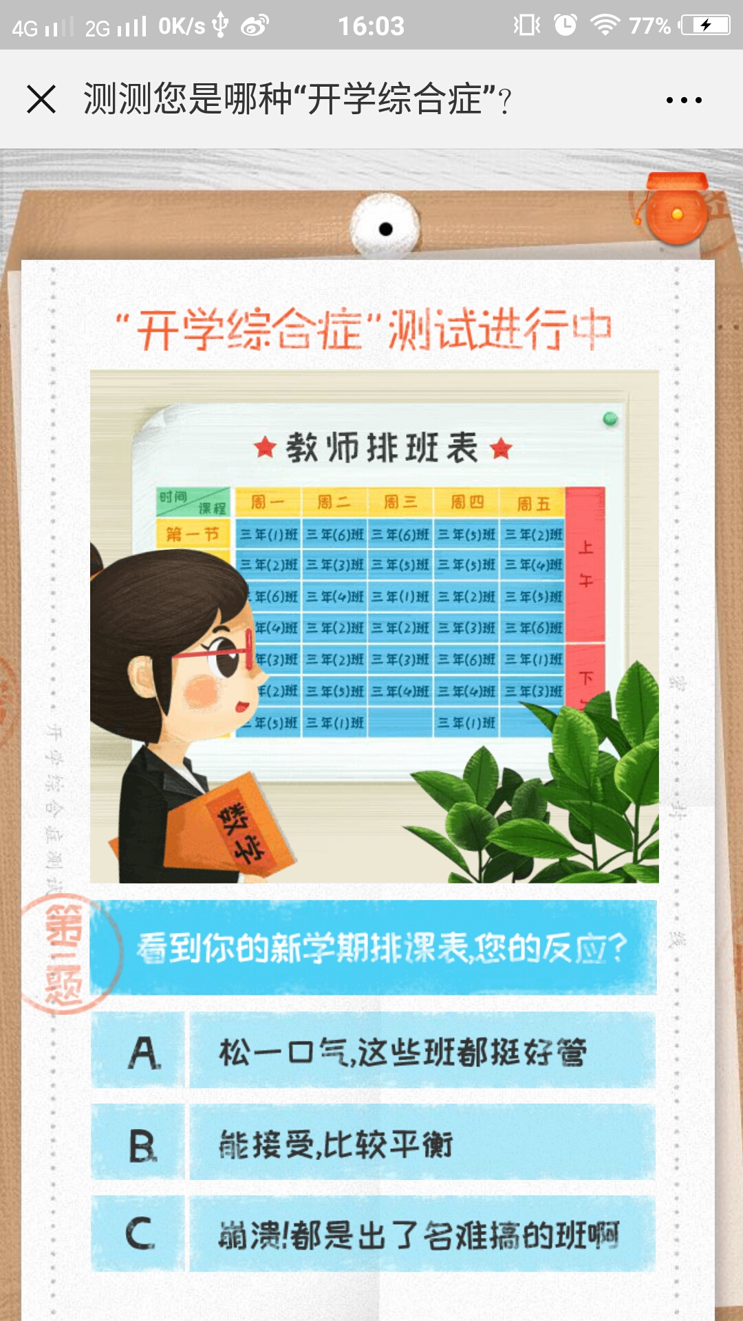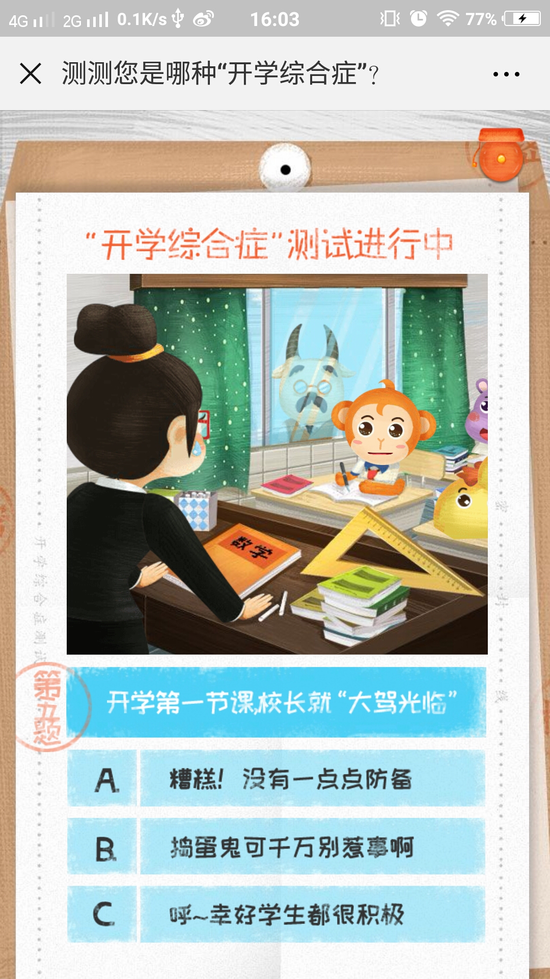 测试答题类,全程共有5道测试题,根据题目从三种选项中选择你的答案,最终会根据你的回答给予你相应的评价,尾页会向您推荐班级优化大师APP,喜欢就去下载吧。