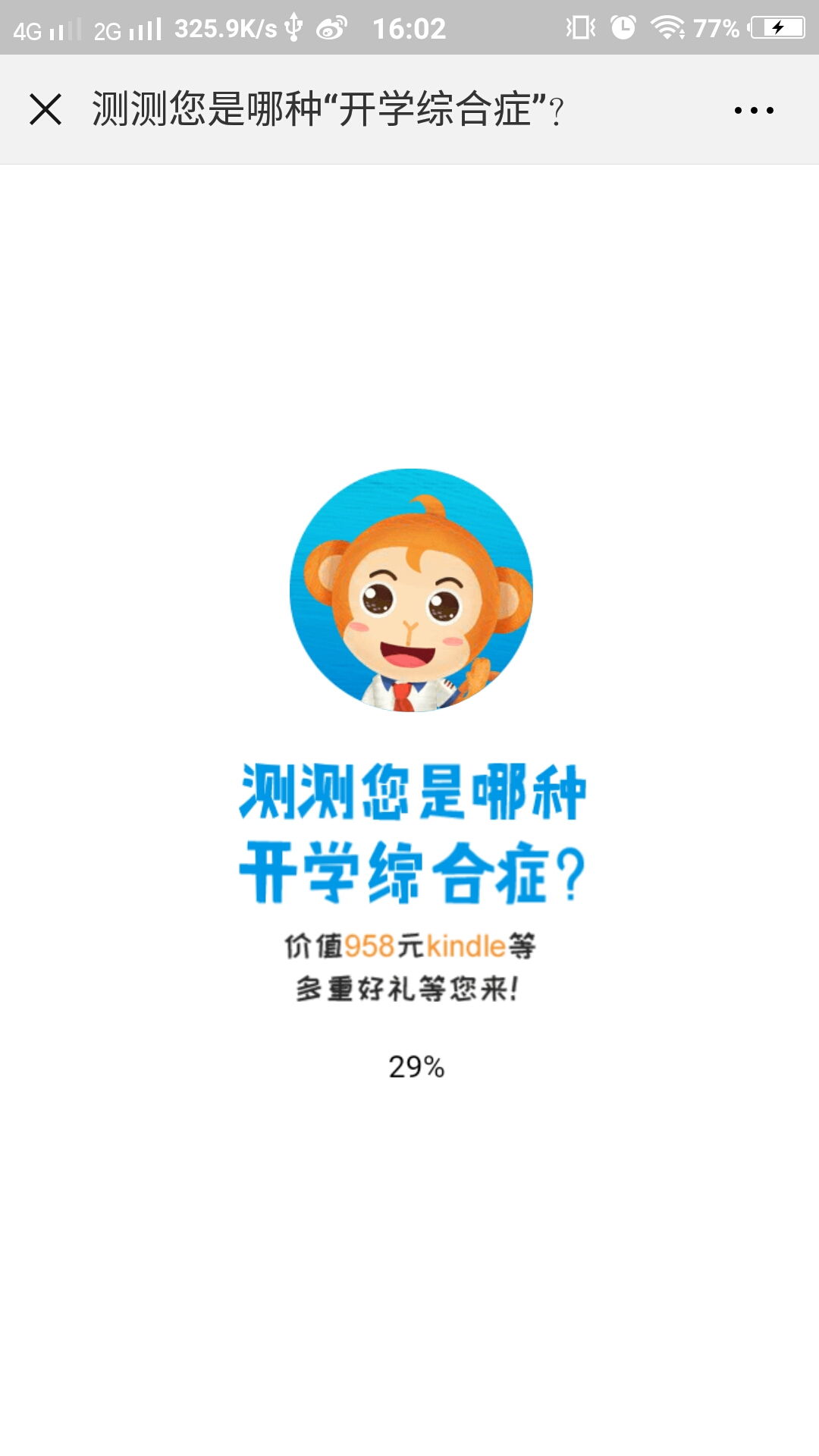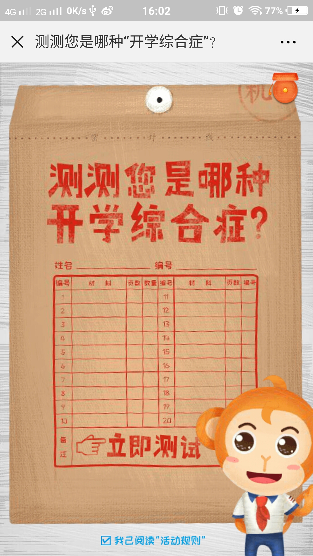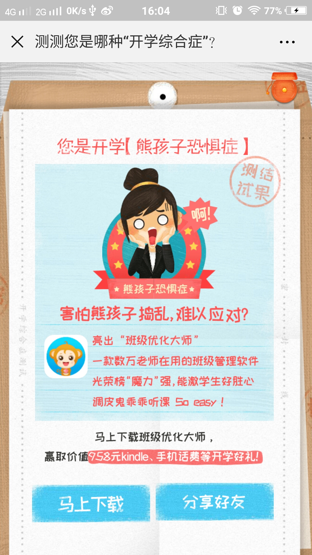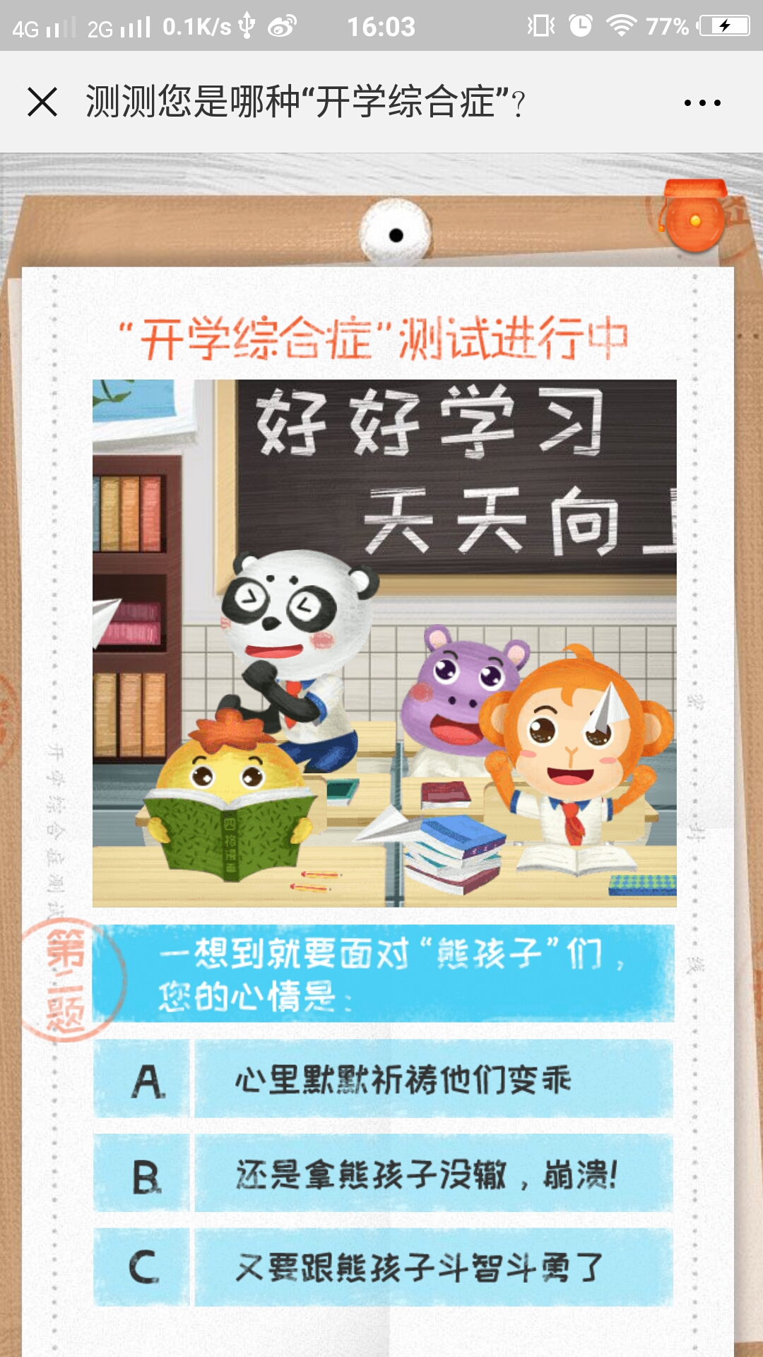 测试答题类,全程共有5道测试题,根据题目从三种选项中选择你的答案,最终会根据你的回答给予你相应的评价,尾页会向您推荐班级优化大师APP,喜欢就去下载吧。