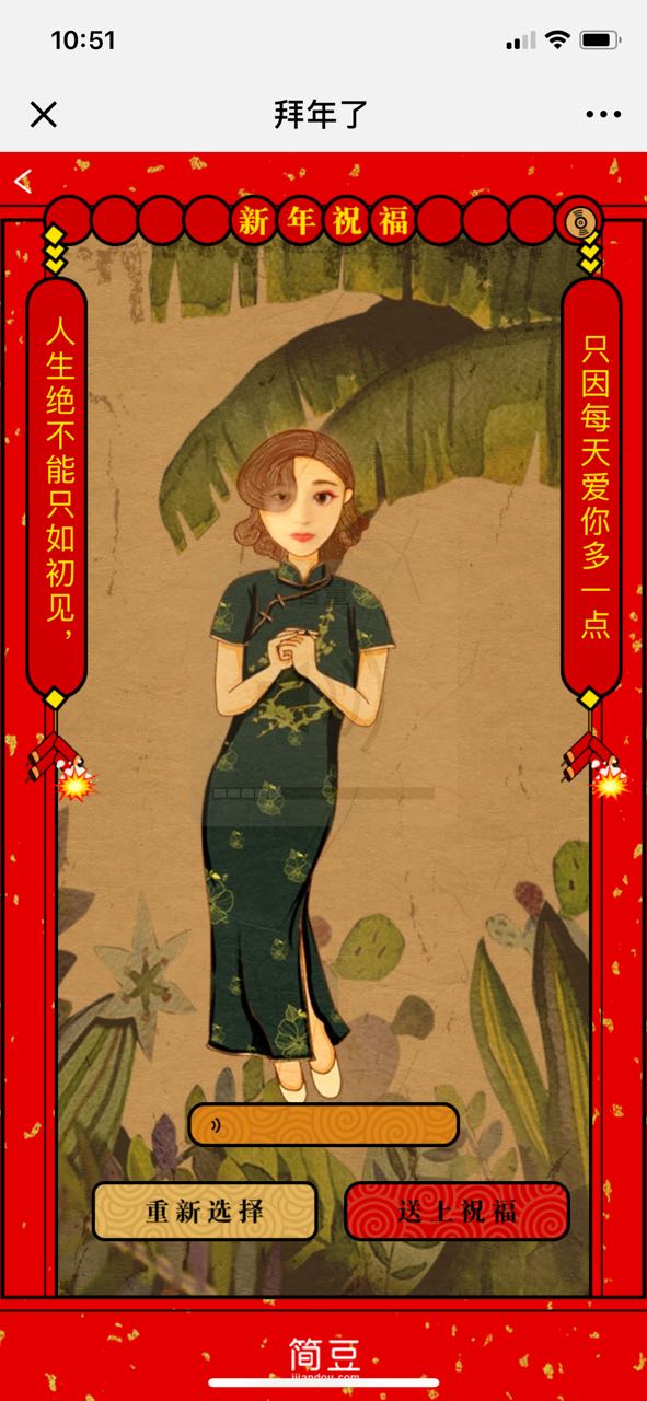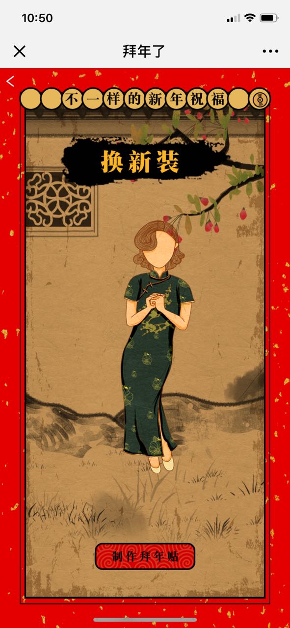 创意上:以拜年为主题,通过“变装,变脸,变声”,展现一个不一样的拜年方式。有男女两大类,拜年人物选择,每一类还分6个年代,分别为:汉朝、唐朝、宋朝、明朝、民国、现代。人物选择完毕以后,上传照片,合成自己专属的人物形象;而后选择拜年的对象和拜年词,也可以自己编辑,最后语音合成,发给朋友,你的独特拜年!