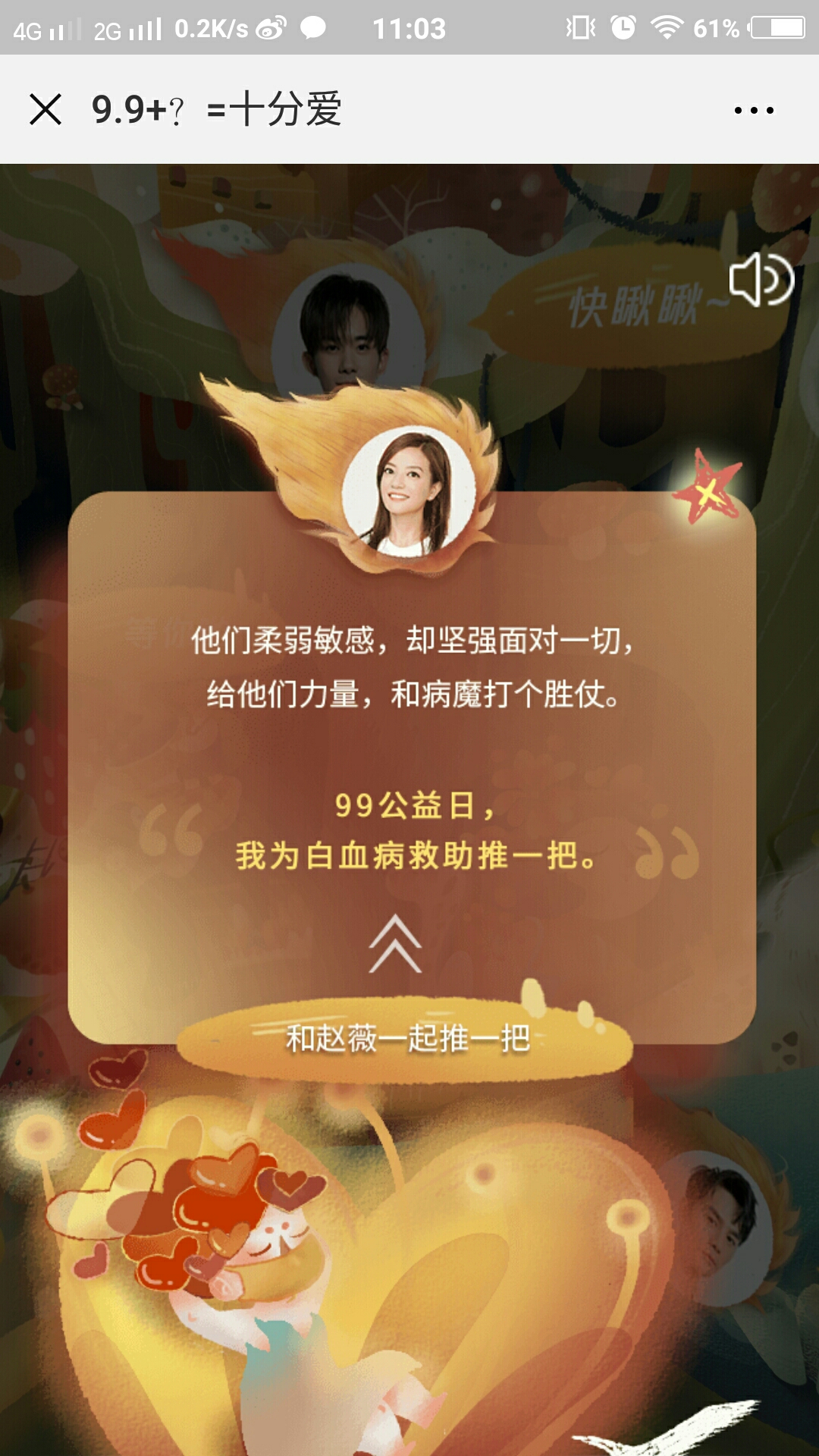开头一段101少女为腾讯公益演唱的视频,约30秒,用户可选择逃过。后续为用户参与部分。策划步骤:①在礼物盒页面上划,来到明星爱心助力陈列区,一共8位明星的头像,分别代表不同的公益项目;②用户点击任意一个头像,可查看该公益项目,上划可以“推一把”,与明星共同助力,生成公益证书;③ 点击“再推一把”,可回到陈列区,点击“一起爱吧”跳转到腾讯公益的界面。