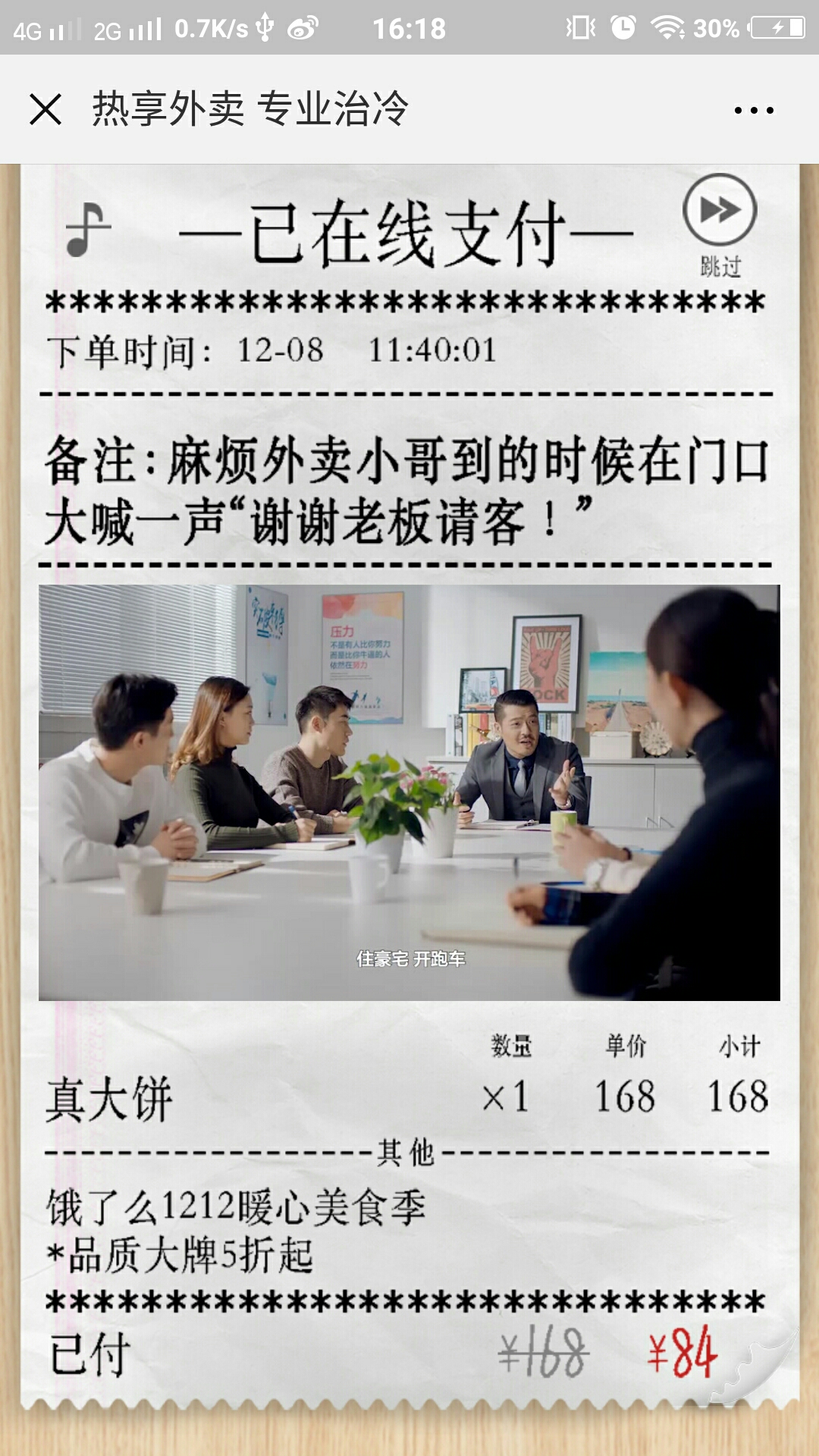 该H5使用了真人视频,调整视频的尺寸,与小票融合成为一体,很有意思;同时,将饿了么外卖餐点与人们常说的口语结合,“心急吃不了热豆腐”、“画大饼”、“吃奶的力气”、“我不是吃素的”等等,突出其产品的丰富性,只有想不到,没有办不到。
