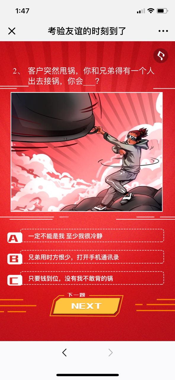选好后进入测试,一共六道题目,最后一道题选择完成之后则跳到结果页面。