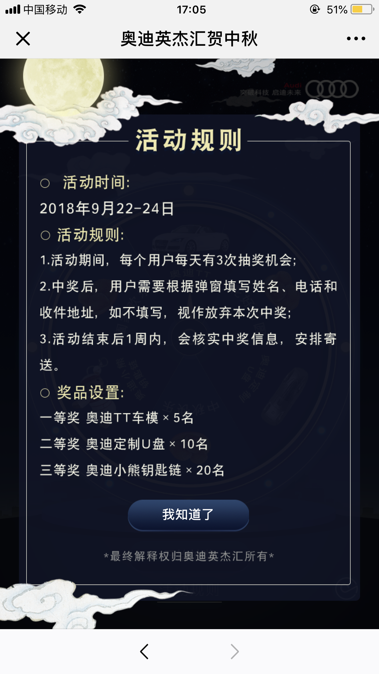 1. 策划上:以中秋为主题,首先是中秋的月亮,配6个人物(奥迪英杰汇的成员)和奥迪汽车的剪影;点击“去赏月”,进入2.5D的城市,不同的城市景物配合不同的奥迪英杰汇成员,老爷子马未都配茶馆、江疏影配购物商场、马龙配体育馆、杨澜配幸福小区、张亚东配音乐厅、黄轩配电影院,每次停顿到对应的城市景物,还可以点击看对应英杰汇成员对大家的祝福,有视频也有音频;最后还有抽奖环节