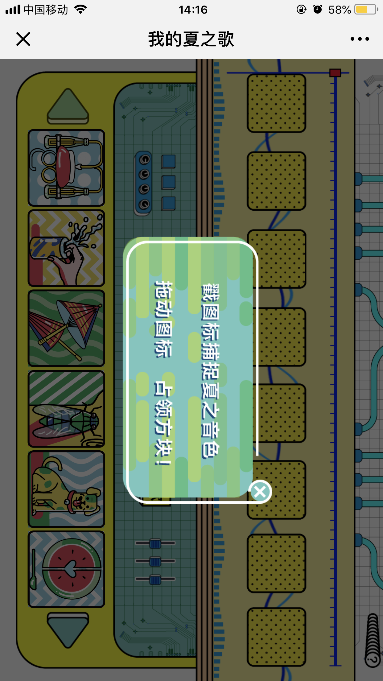 策划上,以夏天的声音为出发点,通过夏天的声音,形成一串音乐。首先进入H5以后,提示“戳图标捕捉夏之音色”,页面的下方有10种声音,点击可以先听一下,有喝饮料的声音、开饮料的声音、蝉鸣声、小狗叫声等,把下面带有声音的图标,按自己喜欢的声音节奏,拖动到上方8个空格中。可以点击下方播放按钮,先试听一下声音,如果觉得不合适,可以删除声音图标,重新排列声音图标。最后点击[生成我的夏之歌]按钮,你的夏之歌就创作完成了!可以把你的歌曲分享给朋友或者分享到朋友圈,随你!