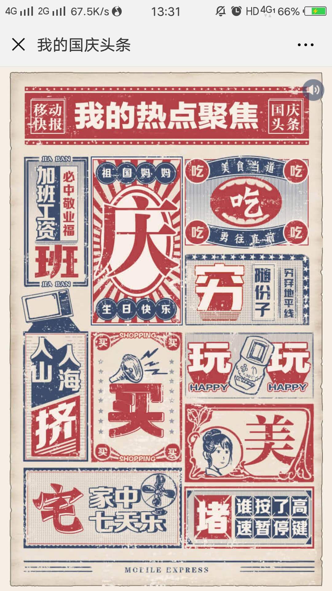 策划上,进入案例后,看到关于国庆节各种信息的移动快报,有热烈庆祝新中国成立69周年、国庆节高速路拥挤的信息等10条信息,点击“领取国庆大礼包”跳转到中国移动和包支付的话费劵领取页面。点击“我要上头条”按钮,有10个模板可以选择,选择其中的一个模板,左侧是预置好的图片,右侧可以自己上传图片,下面还有根据每个模板不同的4个备选文案,点击“发稿”按钮,就可以合成一张国庆头条海报。