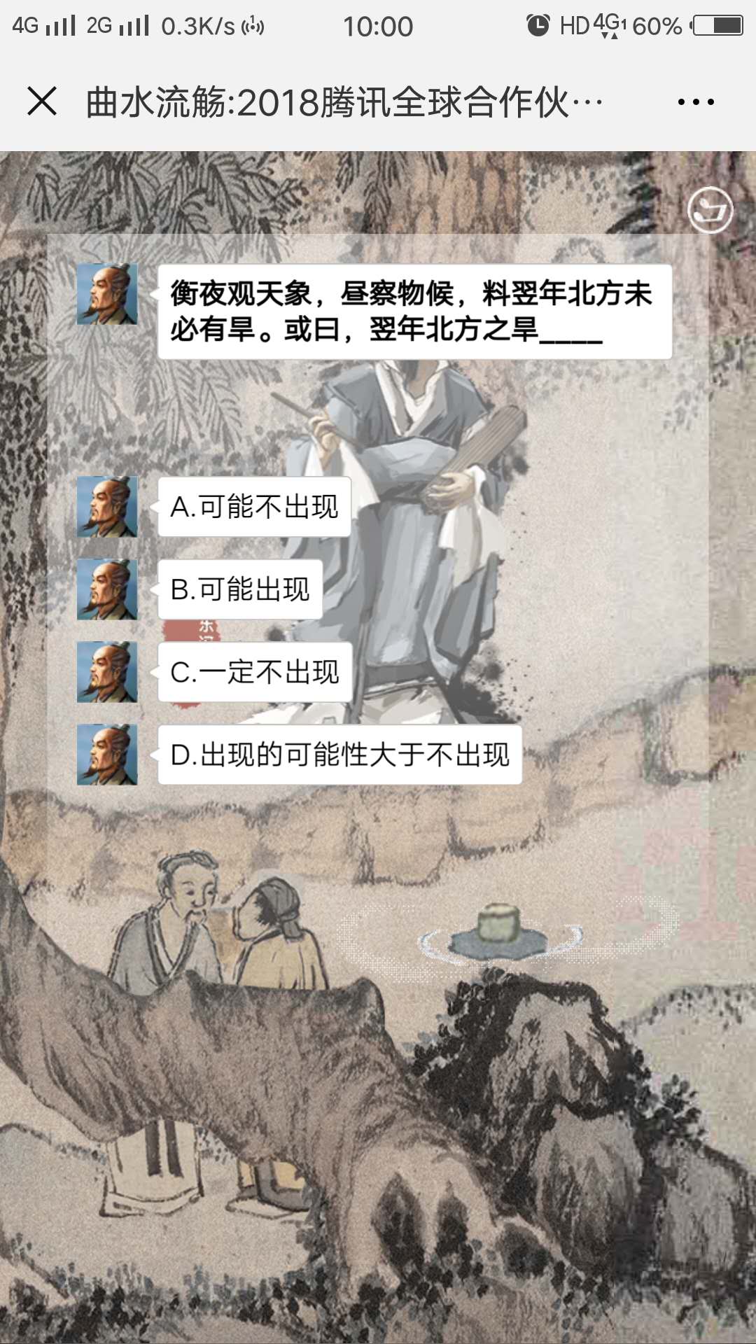 策划上,以“曲水流觞”以引子,通过古香古色的画面,展示一杯酒,顺流而下,遇到8位历史人物,分别是西周姜子牙、春秋鲁班、春秋范蠡、西汉张良、东汉张衡、东晋王羲之、明朝郑和、清朝曹雪芹。每遇到一位人物,都会出现一道关于该人物的问题;相同人物,每次出现的问题也会不同。最后,根据你的回答,生成一张关于才情、韬略、创造、经营、运气的海报。