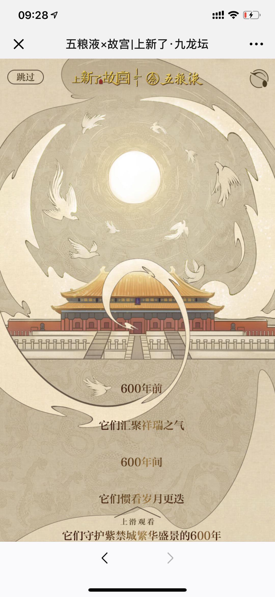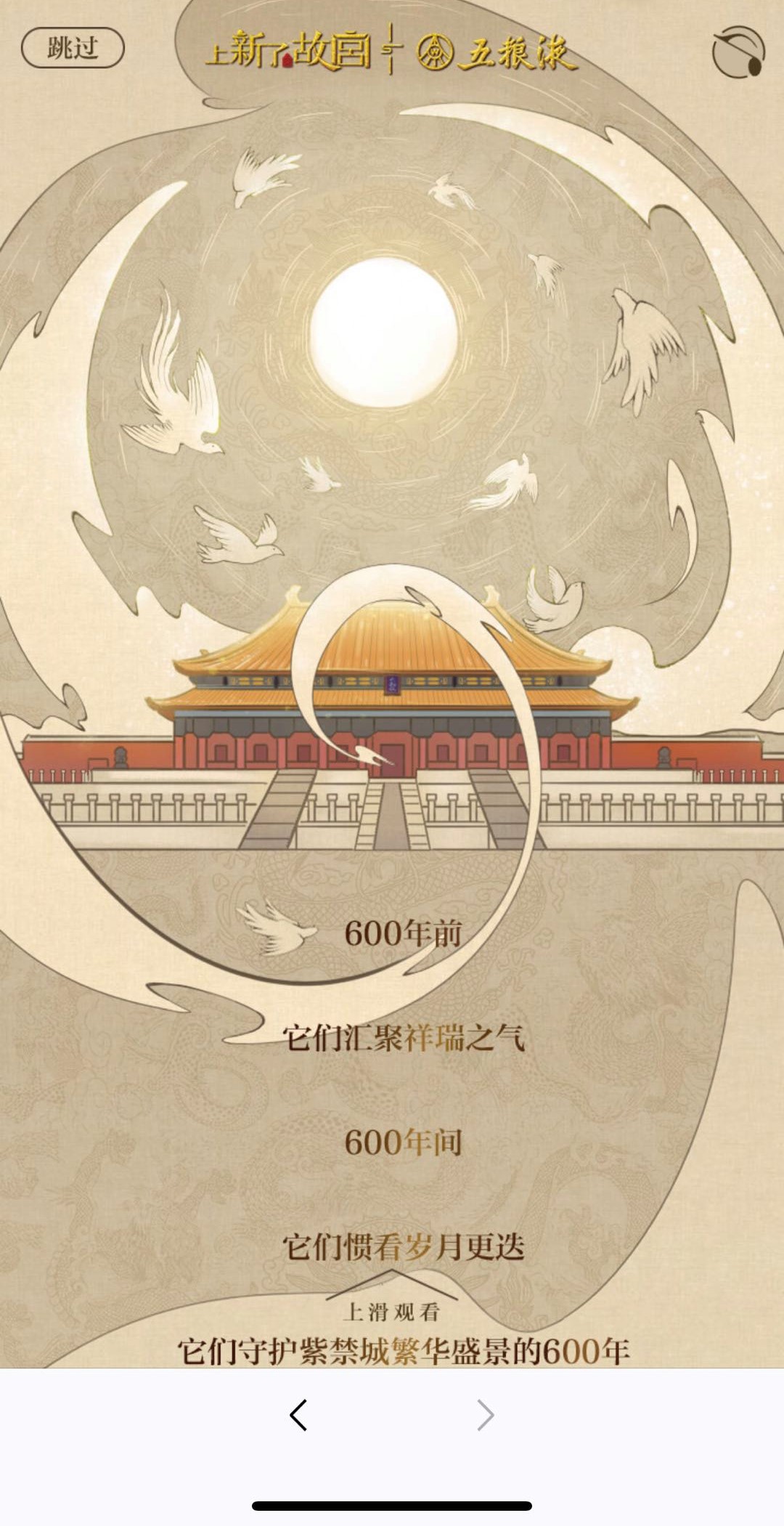 这是五粮液与《上新了故宫》联合制作的一支H5,将物质文化遗产和非物质文化遗产完美的结合了起来。