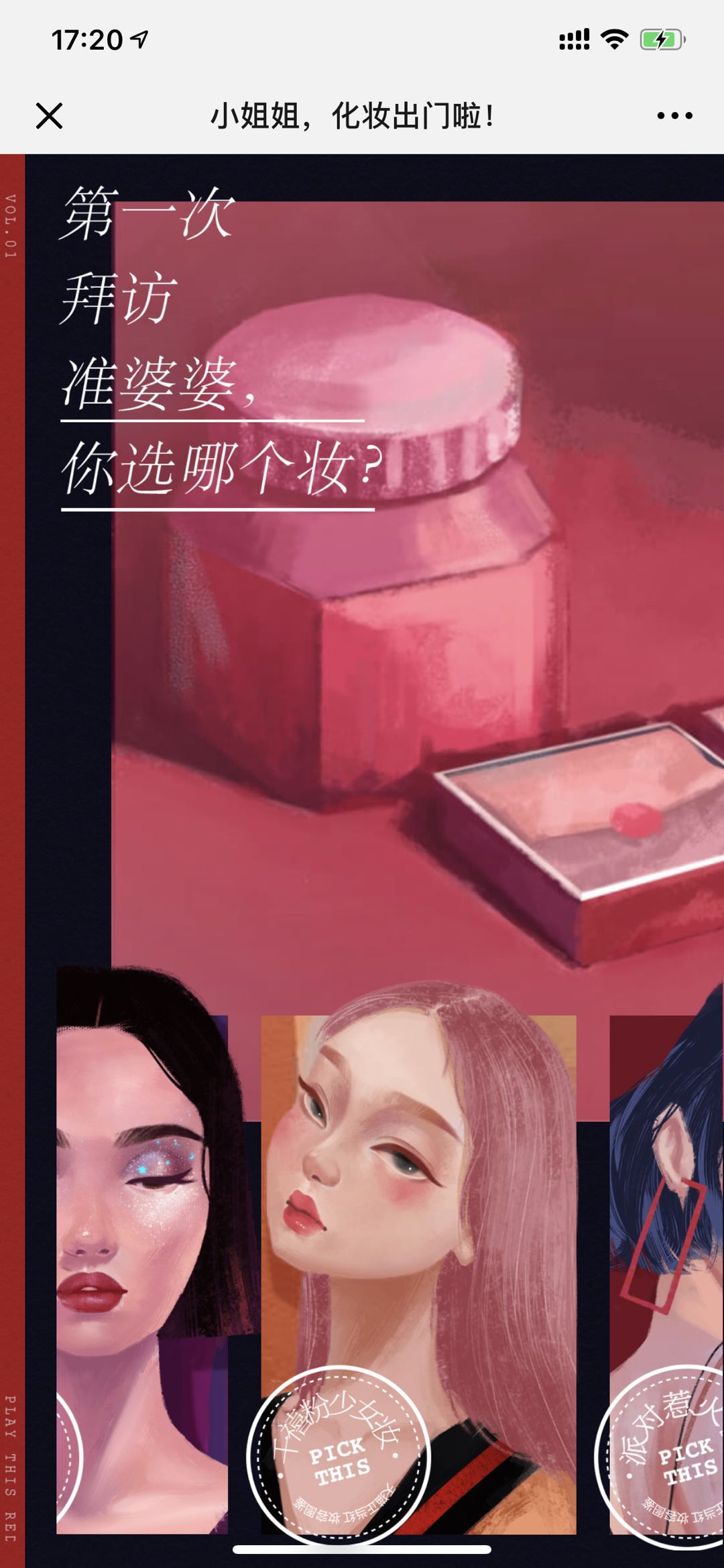 策划上,以“小姐姐出门见不同的人,化不同的妆”为主题,测一下你的脸,到底有多能变,点击开始。一共有十种不同的装扮可供用户选择,根据问题来选出适合的妆容。最后生成一张美妆称号的海报,长按可以保存,点击下面的按钮可以看到当红妆容的关键词。