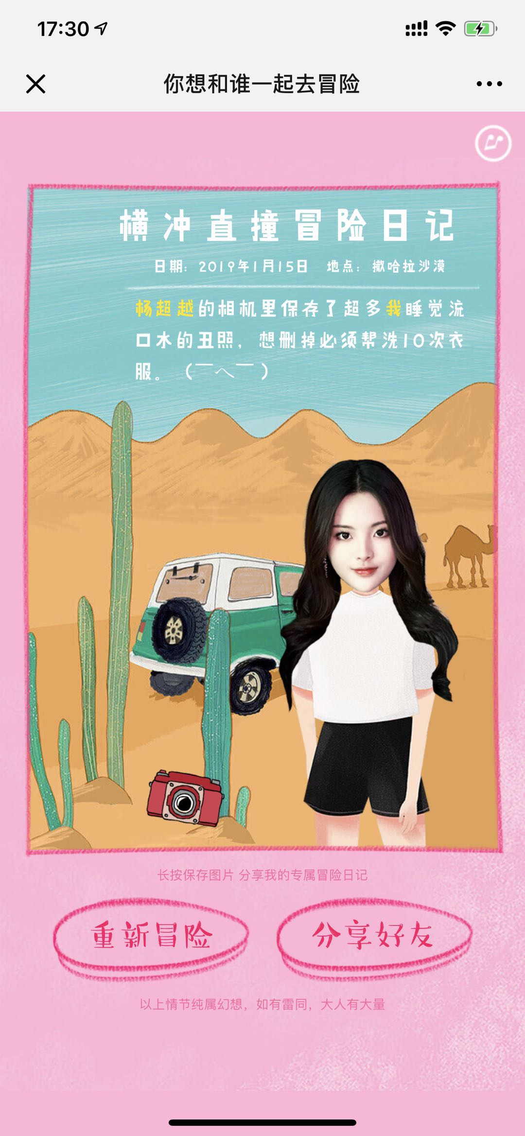 策划上,用户进入页面后,选择背景、冒险伙伴、必备神器。队友是101组合里的成员的真实头部照片结合绘出的卡通身子,冒险地二选一,包括撒哈拉沙漠和雪山密林,必备神器三选一,每个成员的必备神器稍有不同,三元素也可以直接随机生成。最后合成一张你的冒险海报。