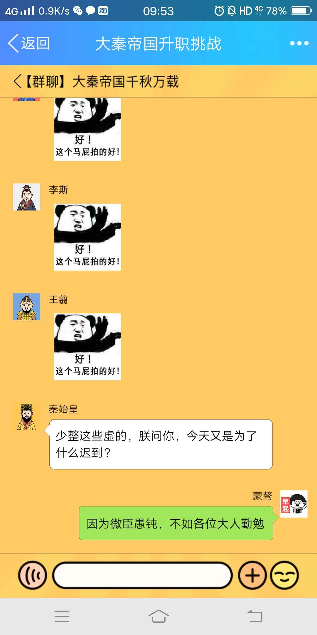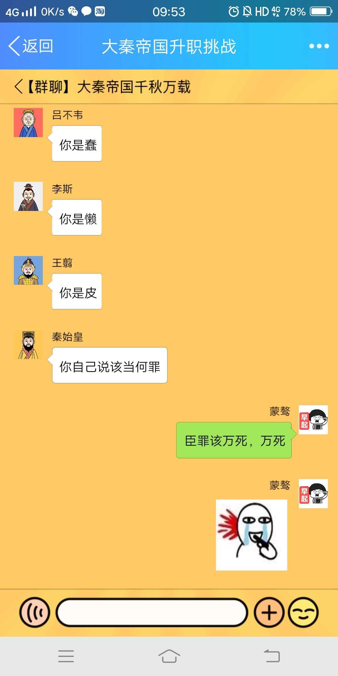策划上:进去页面后提示接收一条微信消息,点击进入后,进入“大秦帝国千秋万载”聊天室,群内是秦始皇与大臣们的对话,用户以蒙骜身份与秦始皇对话,每次对话,用户有三个选项可以选择,根据用户不同的选择,得到最终人物人生结果。