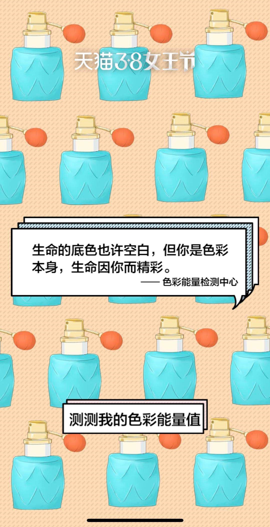 这是天猫推出的一支测试类的H5,在3.8日女王节之际,测试女孩子可能都不知道自己的隐藏属性——色彩能量值。