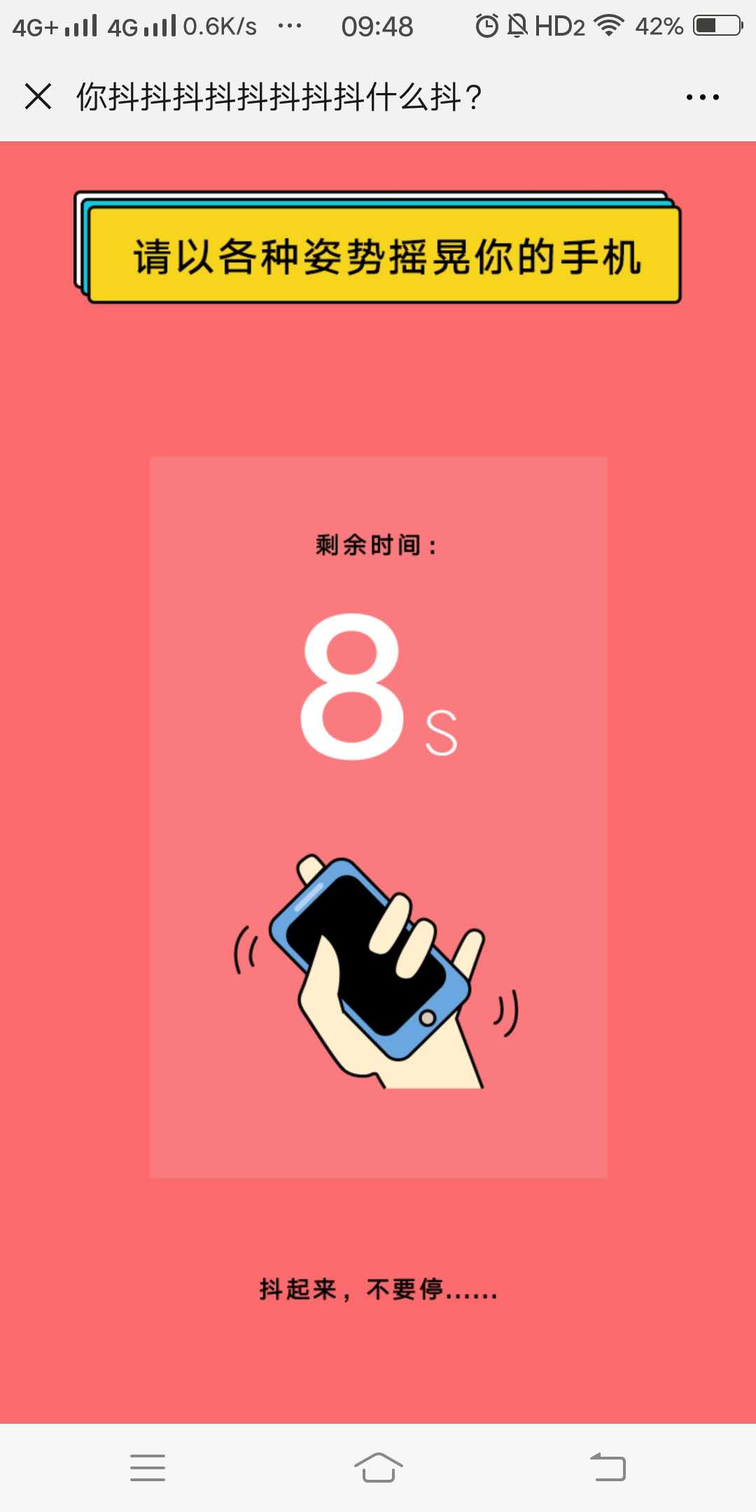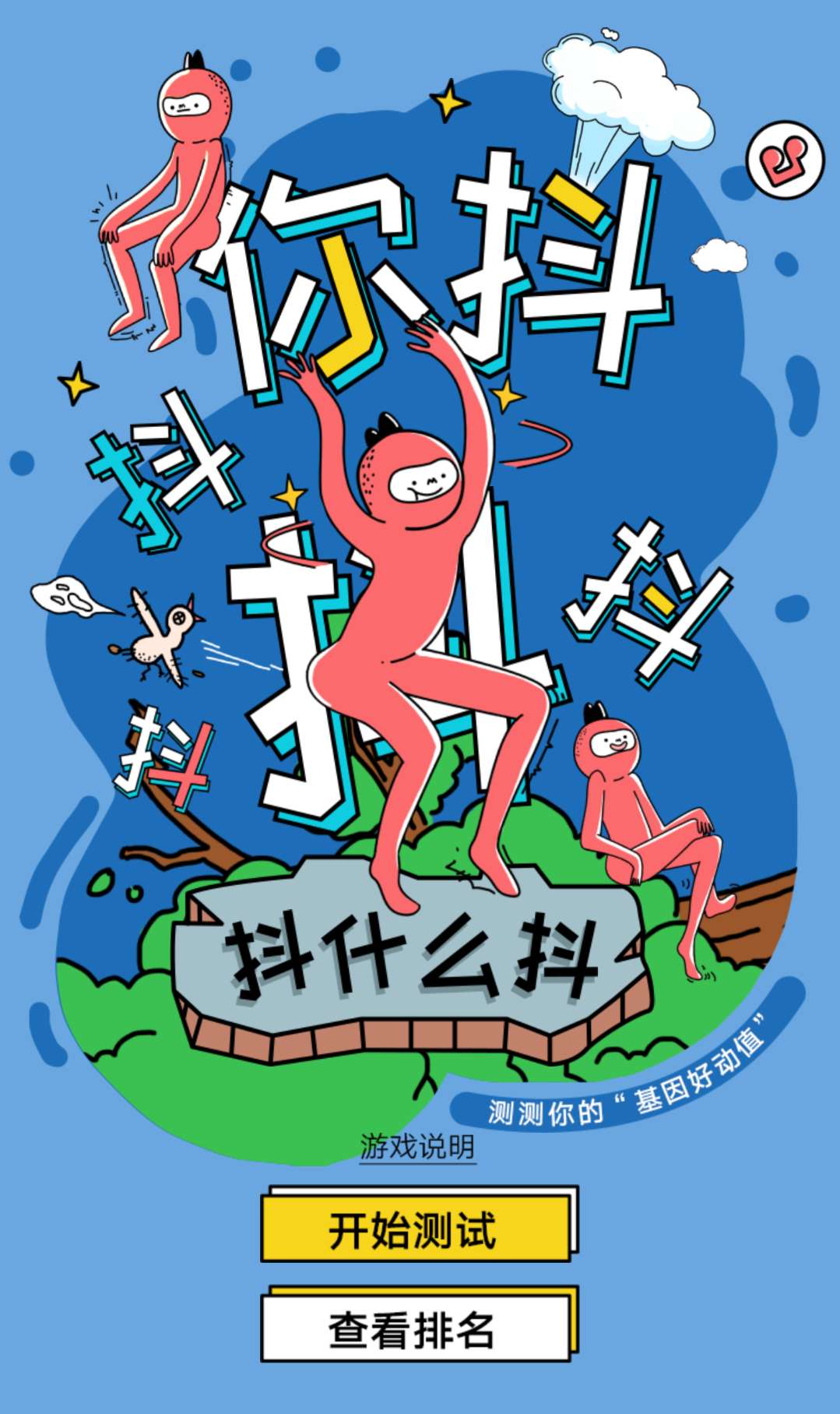策划上,加载页是一个人一直在抖腿,进入首页是一个人物不停抖腿,配合文案“你抖抖抖,抖什么抖”,点击开始测试,先输入姓名,进入手机摇一摇倒计时,是十秒内晃动手机,然后接收“基因检测报告”。点击“接收”按钮,接着出现一段视频(31秒)每个等级的多动症都是什么样的状态。最后生成一张属于你的(ADHD)基因好动值,并有多动症基因鉴定的等级,下方点击“可以加入组织,科学颤抖“出现汉薇基因君的微信号,还有两个按钮,“扶我起来,我还能抖”和“召唤抖友一起PK”。