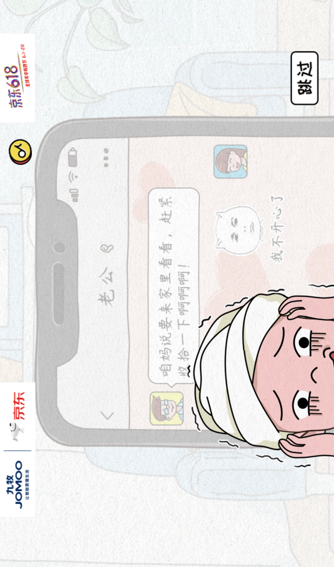 1.开场动画:开头是一个女生开着空调敷着面膜吃西瓜,突然收到老公发来的微信说妈妈要来了,赶紧把家里收拾一下,女生恐惧不已,点击“马上收拾卫浴”