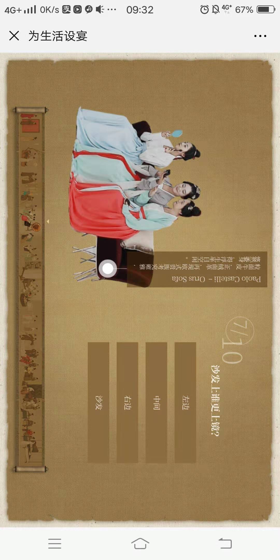 2.首页是红星美凯龙的logo及文案“为生活设宴,2019鲁班设计尖货节”突出H5主题。点击入宴,出现《夜宴图》长图动画,长图自动滑动,展现夜宴的一幅幅场景,这些场景紧扣接下来的十道测试题。播放结束进入测试部分,一共十道题。