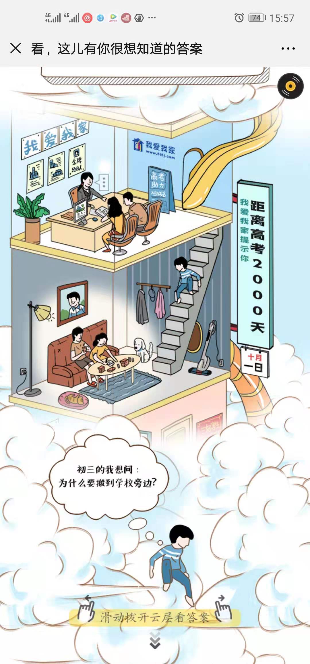 1、首先是拧瓶盖的一个互动,点击后,出现答案,我爱我家画面出现,后面拨开云层会出现金句。