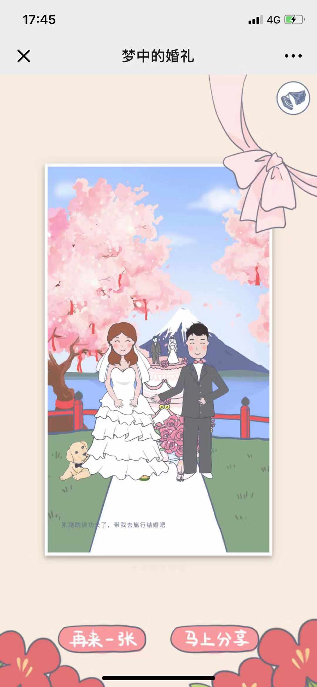 这是一款DIY婚礼的h5,互动性很强,点击开始制作进入DIY界面,制作完成后点击生成按钮可完成一张婚礼场景海报,长按可以保存,扫描二维码可以再来一次。