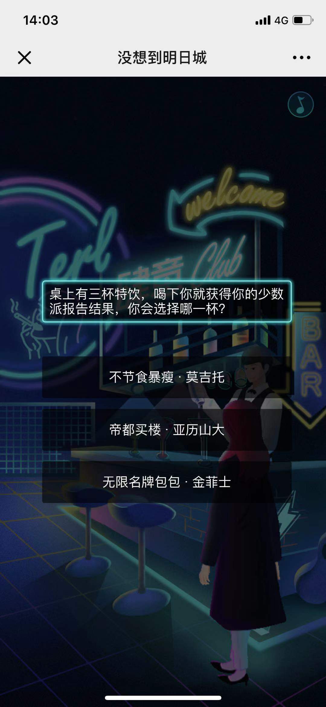 进入首页先观看一段短动画,然后点击前往没想到明日城,选择好性别和输入姓名后即可进入测试,一共五道测试题,测试完成后会生成海报,海报上写有综合指数,运气,努力,欲望等各方面的值数和简单解析,长按可以保存海报,下方有抽取优惠券或者登陆购票的通道。