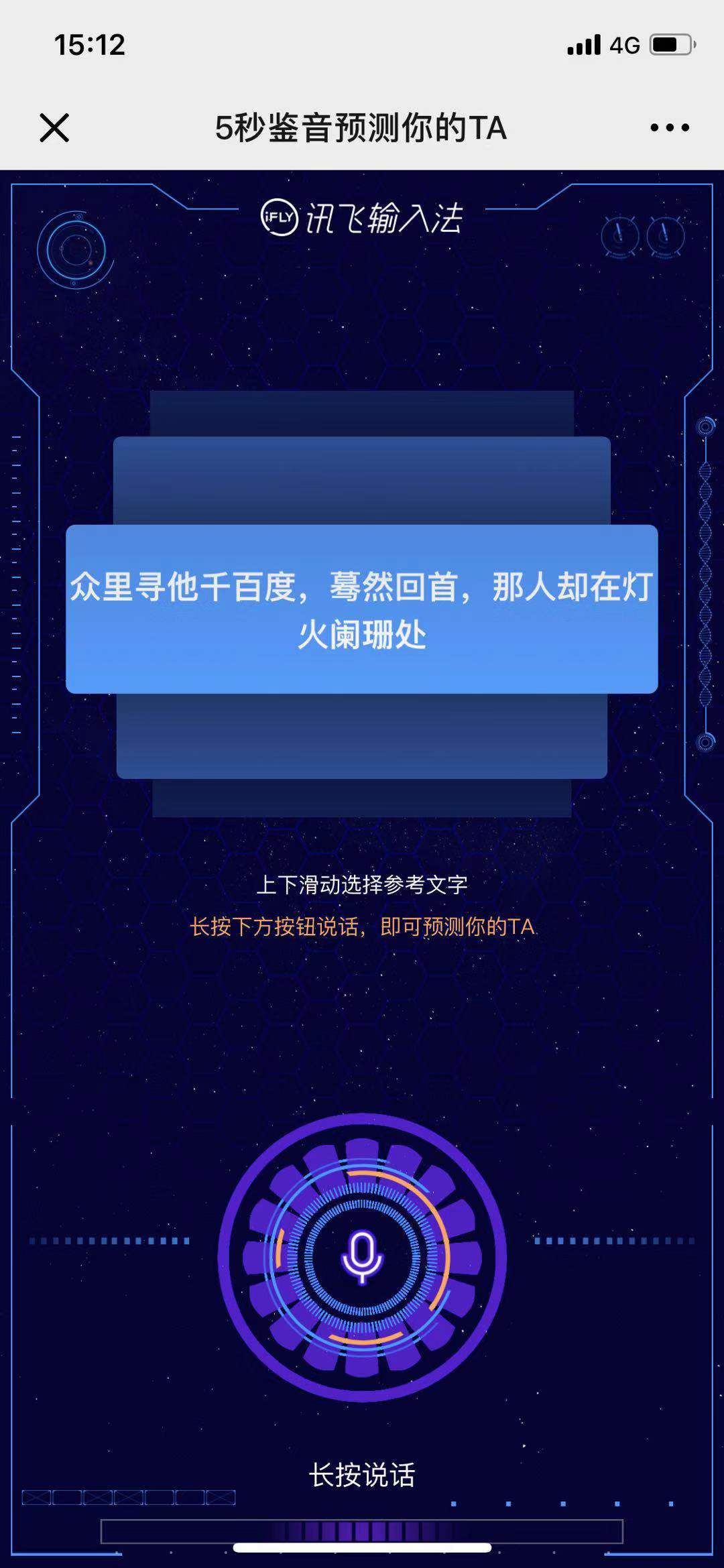 利用语音识别技术,以此测试出另一半是什么样的人。上传后,系统会识别、并匹配出你的另一半是什么样的,各种特质由一张雷达图表示。