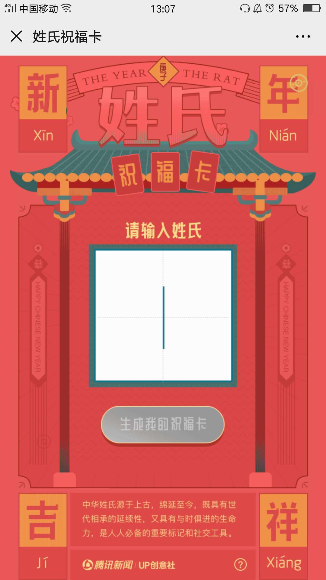 用户进入H5后,输入姓氏,就可以生成我的祝福卡,专属海报。