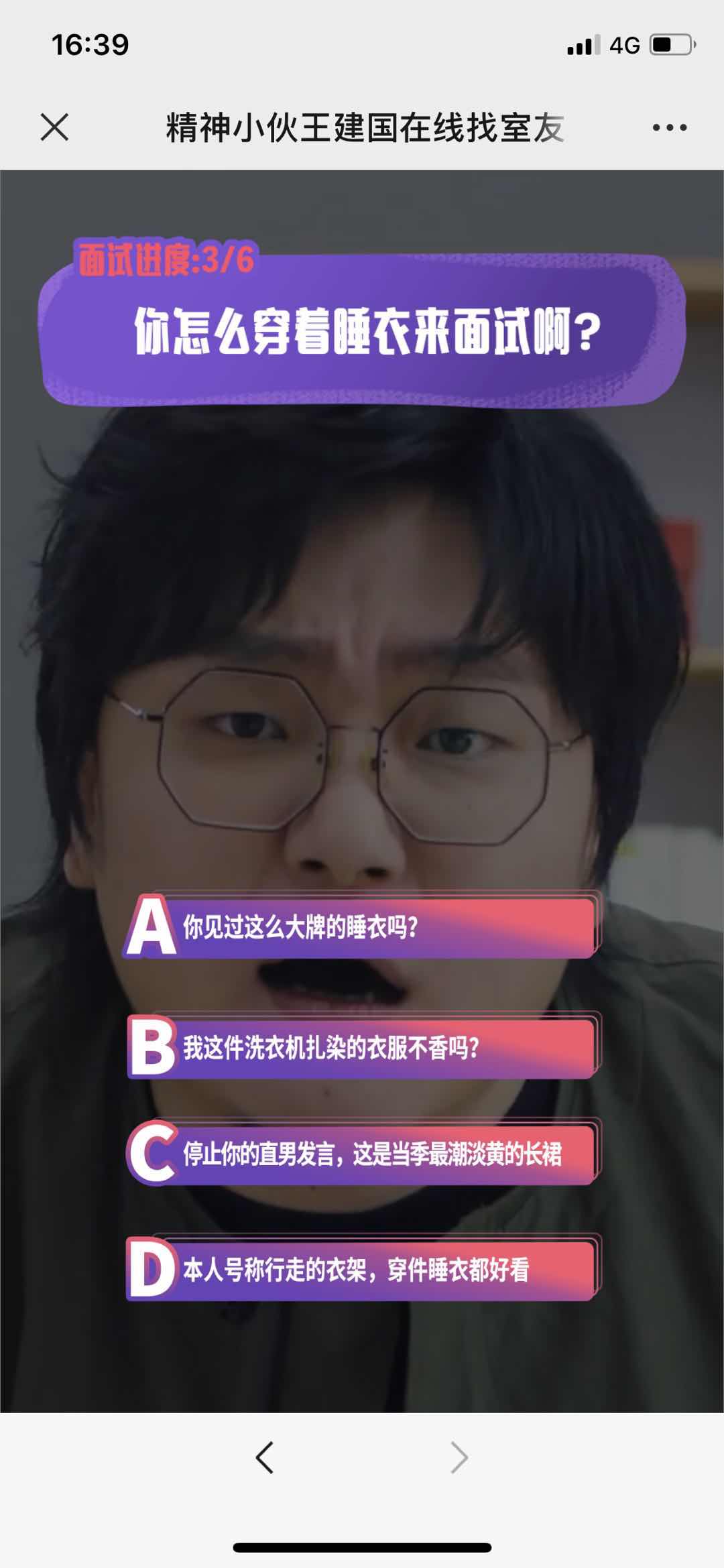 2.该h5以找室友的故事做的一段小视频,然后引申出测试,最后生成一张是否适合做王建国室友指数和解释。