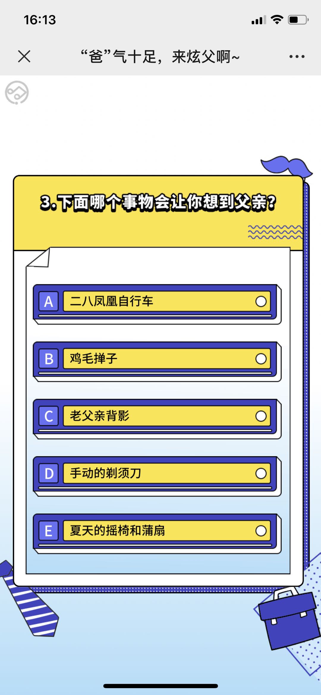 2.有两个答题入口,分别是对老父亲表白和新晋奶爸宣言,用户选择好入口后开始答题,一共5题,答完后会生成一张你的父亲是什么的海报,可以长按保存分享,也可以再测一次