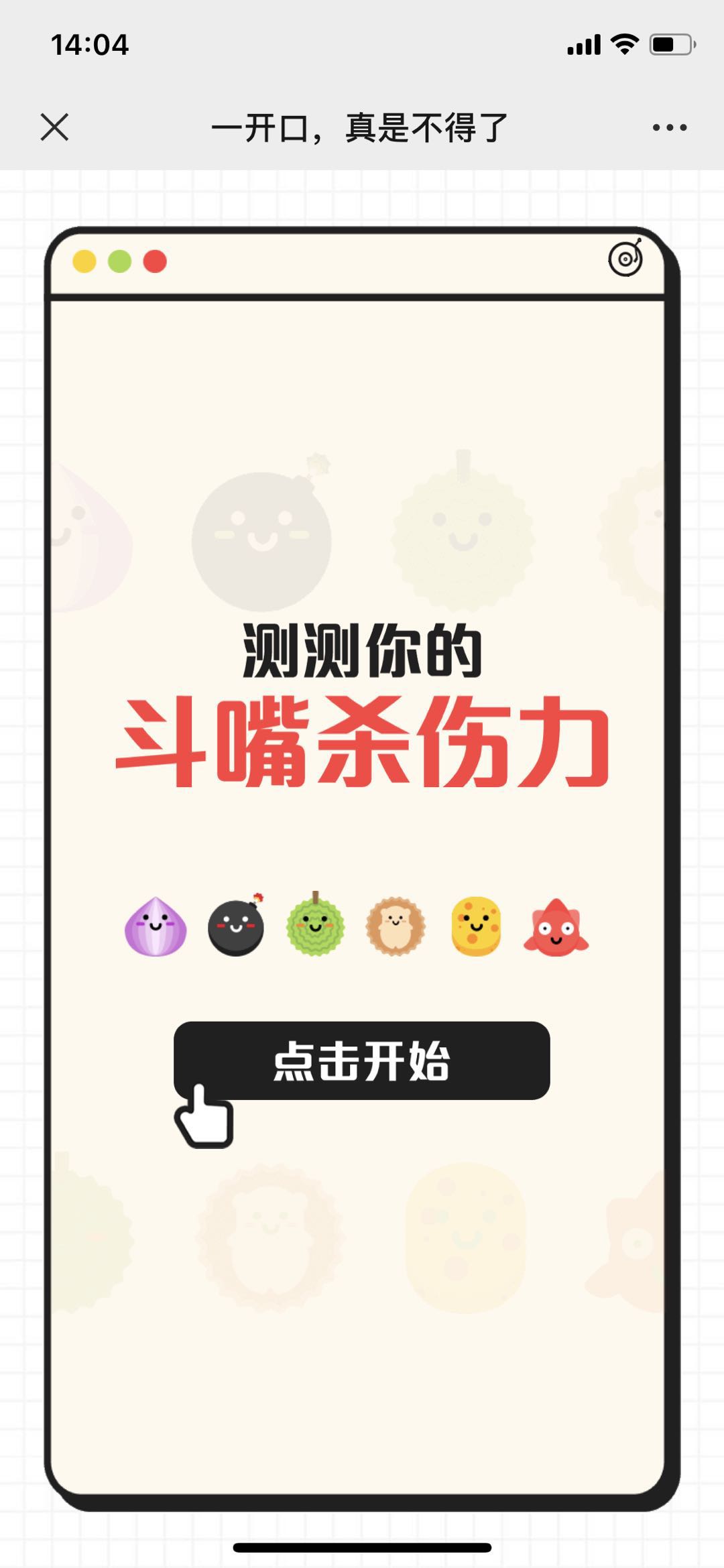 2.h5以你的斗嘴杀伤力展开,一共5题,答完后输入姓名然后点击生成报告,就会生成一张杀伤力指数海报,可以再测一次,也可以点击段位升级道具