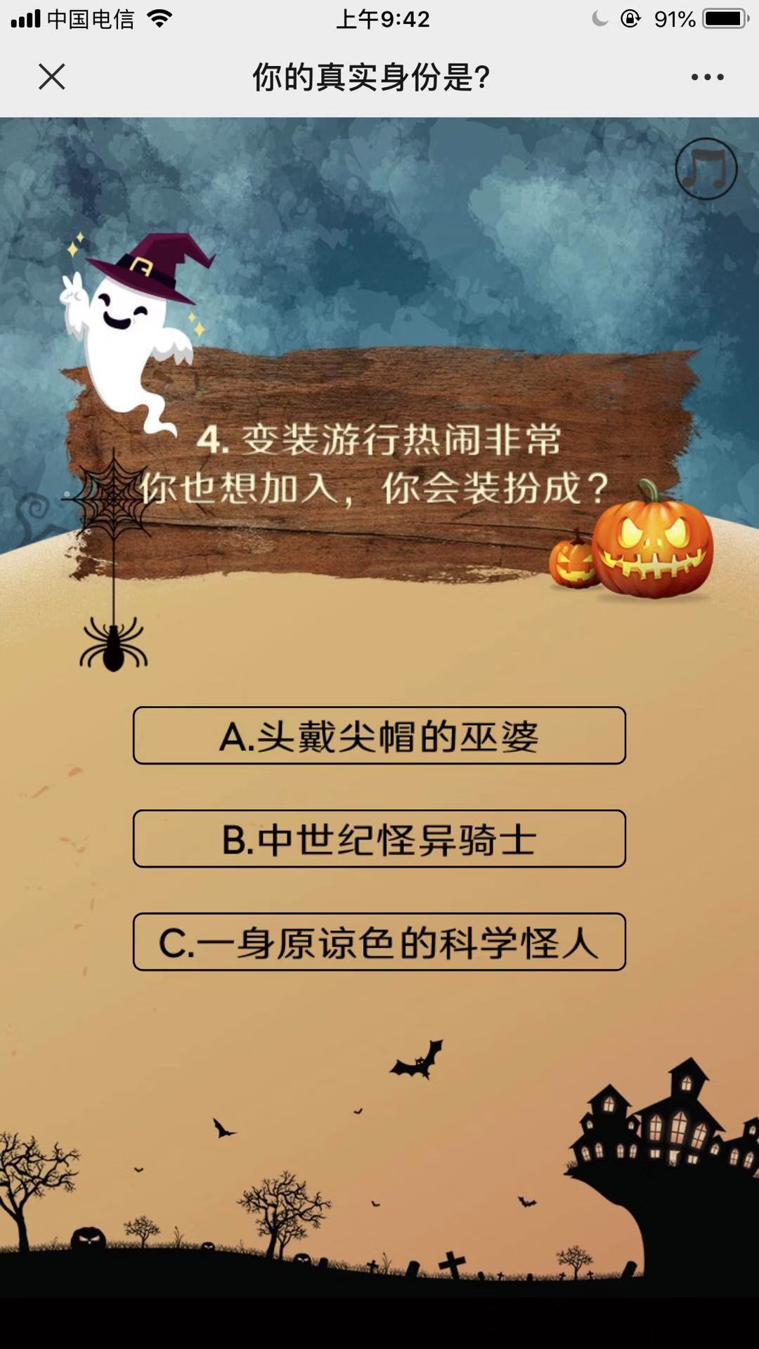 这是一款测试答题类H5,结合万圣节的元素和问题来测试参与者的隐藏身份,以夜晚为背景营造一种神秘恐怖的氛围,通过5道题的判断,最后生成隐藏身份的海报,并且可以邀请好友参与,增加活动的传播效果和品牌的宣传。