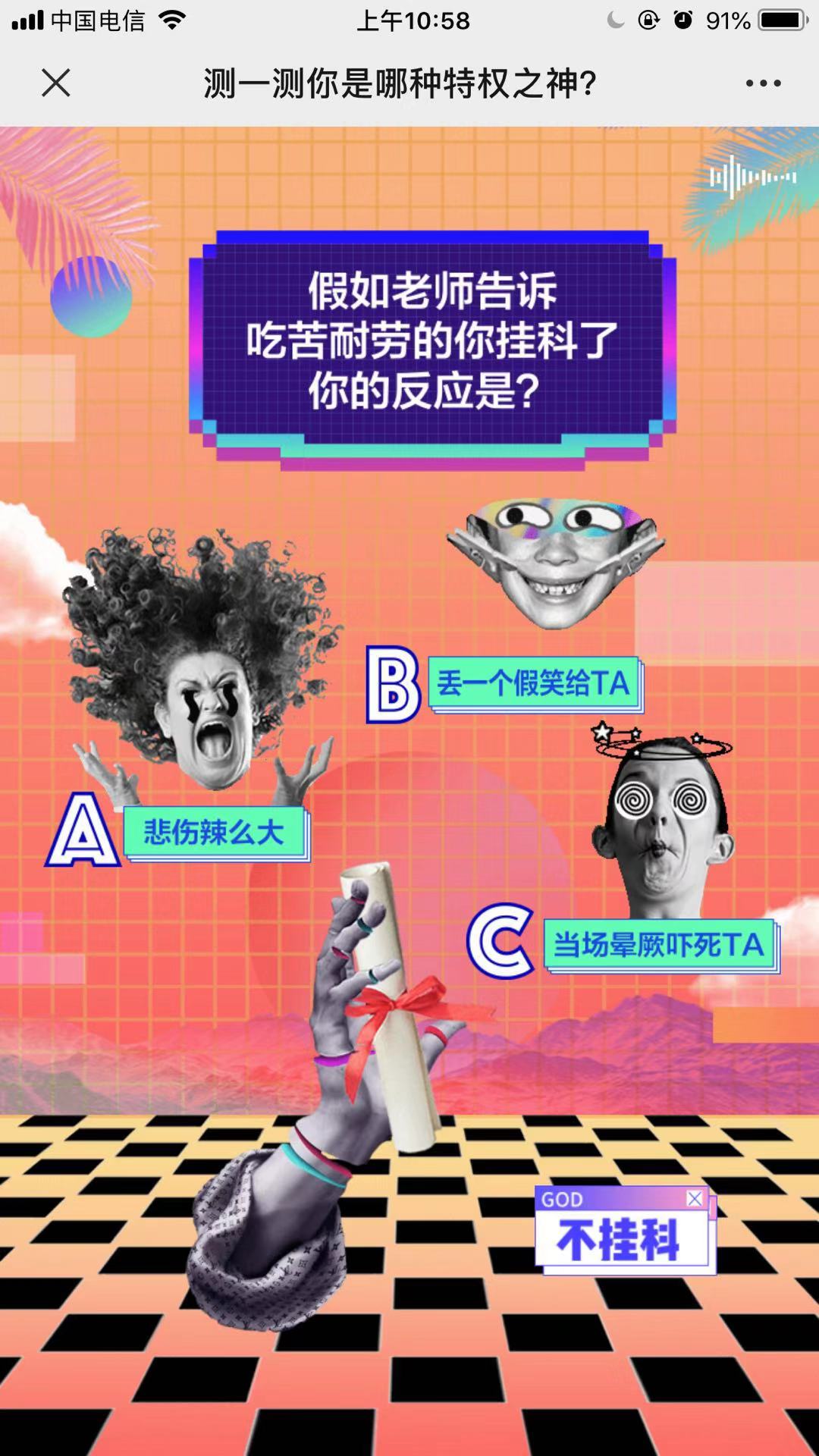 2、通过对5道题目的选择,测试如果自己被赐予神之位将有什么特权。题目的选择搭配夸张的图片显得十分独特,页面比较炫酷,最后根据测试的结果生成特权海报,也可以点击进入到相关的商城。
