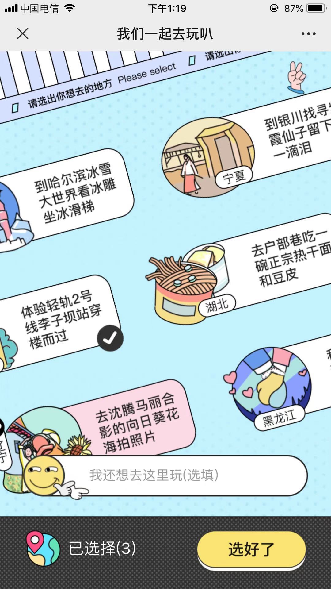 根据展示的内容,选择想去游玩的地方,最后生成一张游玩海报,可以长按保存海报,分享给好友或者朋友圈。