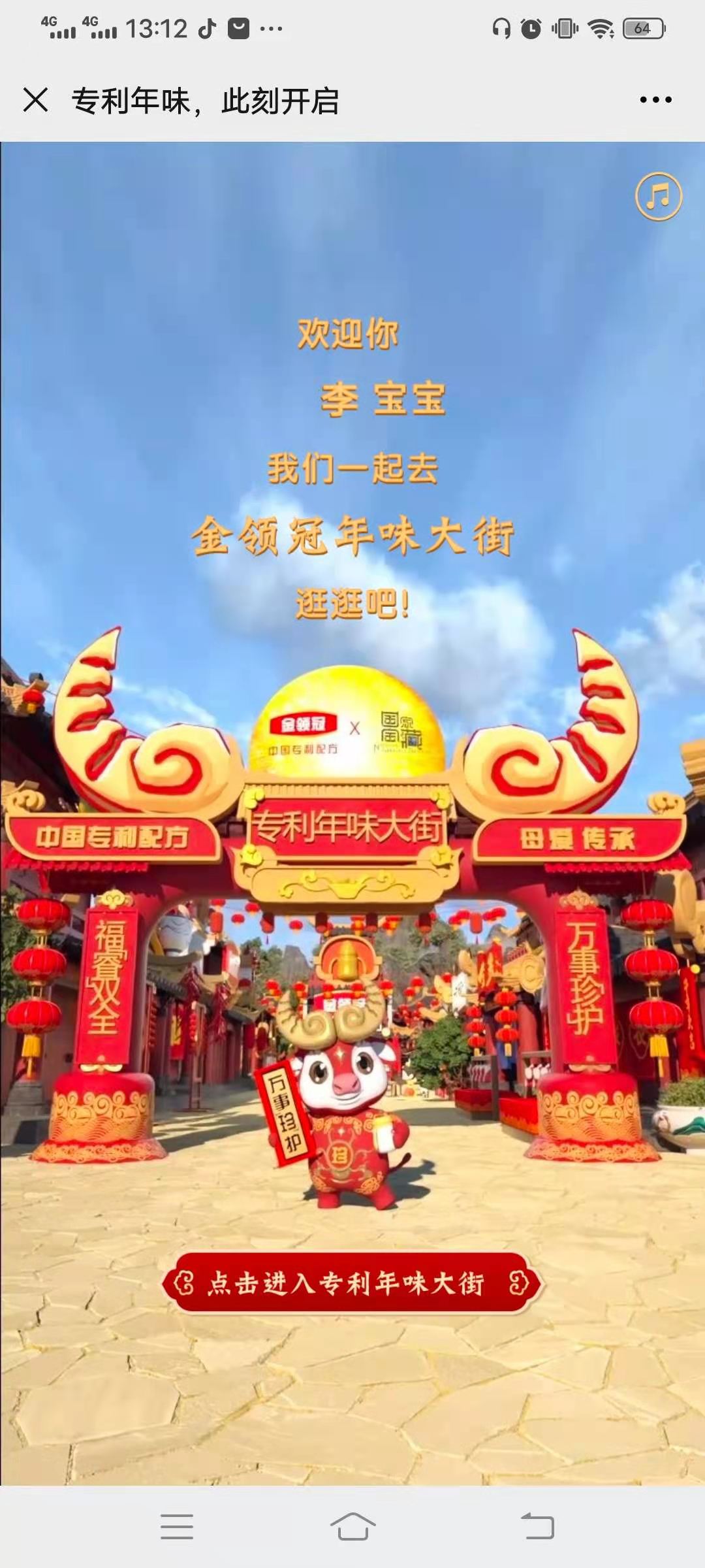用户进入H5,点击进入专利年味大街,输入姓名,确认,开启进入专利年味大街,寻找产品特色,最后生成专属海报。